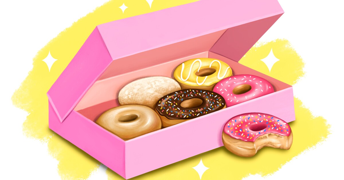 Across Southern California, what do we have? That would be carnation-pink boxes, which certainly mean the contents are doughnuts from an independent bakery. We’ve been thinking a lot about those pink boxes lately, probably because the doughnut Friday tradition organized by a handful of co-workers is one of the few things we miss about the in-office environment. When a Pepto Bismol-pink package landed on the counter in pre-pandemic times, the sugar rush wasn’t far behind. Why do so many L.A.-area doughnut shops prefer this particular hue?