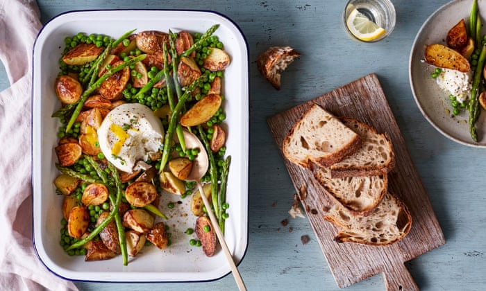 This is a lovely seasonal traybake, starring a whole baked ricotta at the centre. Drizzled with olive oil, sea salt and herbs, the warm ricotta works beautifully with the crisp, lemony roast potatoes, the garlic, peas and asparagus.
